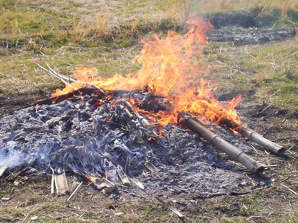 271571a9.jpeg年を越して、寒さも日々増してきています。こんな日は、やっぱり焚き火ですね。ってな訳で田んぼの片付け作業をしてきました。今日の作業は竹置き場の整理。秋に稲を干した竹が年々溜まって下の方は脆くなって来ているので、使えなくなった竹を処分ってことで・・・焚き火をしてきました。竹には油分が多いので、とっても燃えやすい上に、連日の乾燥注意報で燃えやすさ倍増中!マッチ1本で焚き火は始まりました。竹の山をどんどん崩して行き、腐ったり割れた竹を選び出します。スタッフの熊ちゃんも竹を運んでは焚き火に投入していきました。北風も吹き飛ぶ焚き火でしたよ。