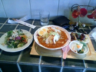 大和のお店の名前は「まかんまかん」写真は今週のランチです。メインはイスラム風カレーラーメンと言える「ラクサ」とサラダにピクルス、中華風に柔らかく煮た鶏でした。ボクがマレーシアで食べたラクサとは違っていて面白い味になっていましたよ。