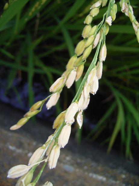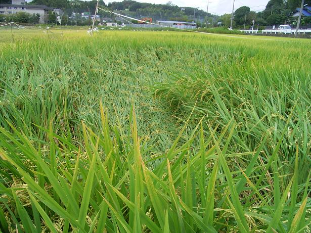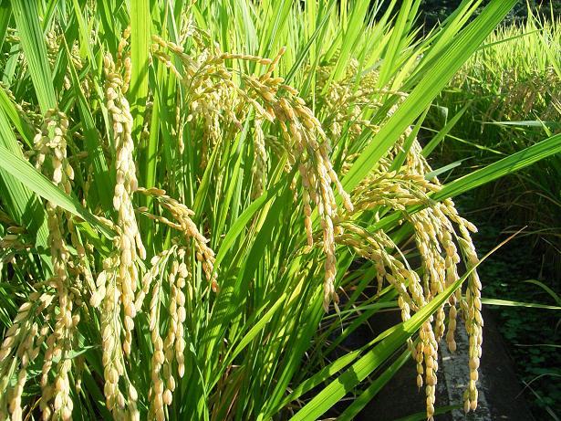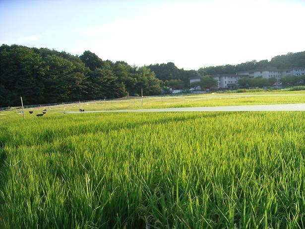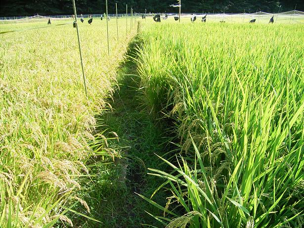 さー、収穫の秋ももうすぐだよ。写真は鳥に中身を食べられて白くなったモミとスズランテープを張った田んぼです。