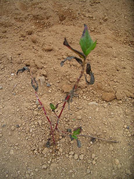 去年までは大きな被害は出なかったのですが、今年は気候のためかどうかは解りませんが、チョット暗躍しています。何とか藍染めには間に合うように育ってほしいですね。写真は順調な藍と根きりにやられた藍です。