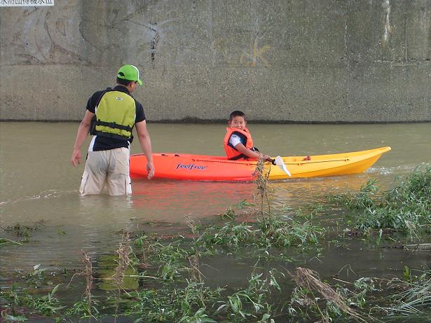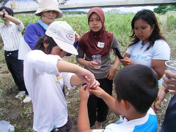 それでも相模大橋の下に陣取り、参加者たちと水質調査をはじめました。ミネラルウォーター、ミネラルウォーター+豆乳一滴、川の水の3つのphとCODを調べて比較。川の水は濁っていたせいで、数値は例年より汚れを示していました。その後の生き物調べは、例年は子どもたちが川に入って生き物を探すのですが、今年は川の水位が高いので、スタッフが代わって採取して子どもたちに見せてあげました。