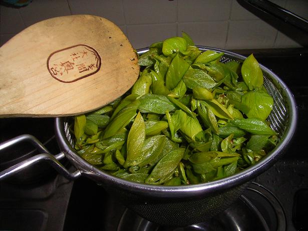 c00326d6.jpeg今日は午前中庭木の整枝作業をやってきました。ほっとくと庭が日陰になってしまうので、柿、梅、木瓜などの枝を落としたのですが。柔らかな柿の若芽を見るとついムラムラと、お茶を作ってしまいました。採取した柿の芽を良く水洗いして汚れを落とし、続いてお皿にとってラップをかけてチン3分。水気を切ってから弱火の中華鍋に入れて、シャモジで混ぜたり、手のひらで揉みながら水分を飛ばしていきます。乾燥したら完成。早速お茶にしていただきました。以外と美味しかったです。写真は原料の柿の芽と柿の葉茶です。e784c8d8.jpeg