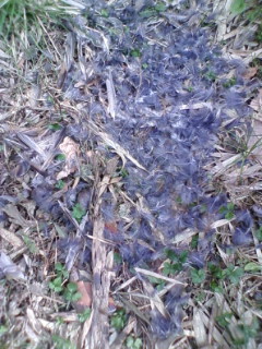 写真は竹林で発見したキジバトの羽毛。どうやら猫に襲われたみたいです。これも自然の一面ですね。
