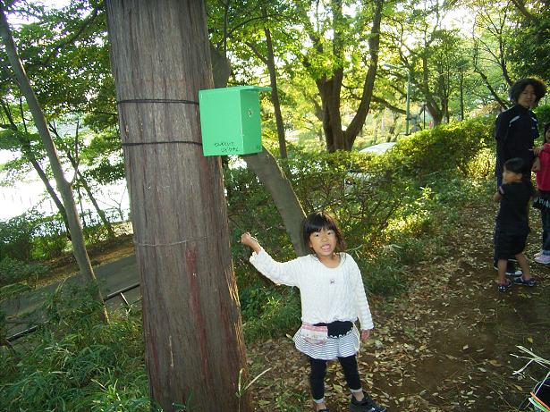 巣箱をかけ終わったらシジュウカラゲーム!4班に分かれた子ども達は、公園の松山エリアに置かれた餌の絵入りカード(これにはイモムシといった本当の餌、ザリガニといったうその餌があります)を探して集めて回ります。集計の結果、C班が優勝!みんなシジュウカラの餌を理解出来たようです。写真は巣箱をかけた児童館の子どもです。