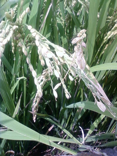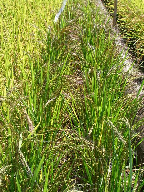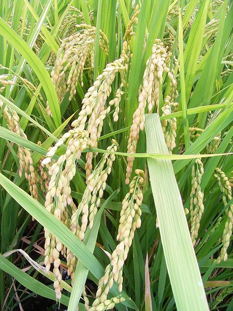 一方田んぼも順調なんですが、田んぼの一部で異常を発見。田んぼへ降りる取り付け道路と同じ高さにあるイネの穂から籾がなくなっていました。この犯人は・・・スズメくんたちです。地球チャイルドで栽培しているサチジマンは葉が穂より長いのでスズメに食べられにくいのですが、取り付け道路の高さに垂れている稲穂は斜面に降りてきたスズメにとって目の前のご馳走になってしまうのです。スズメを脅かすテープも張ったのですが、あまり効果は無かったみたいです。ま、スズメも全部のお米を食べてしまうわけでも無いし、ま、いいか。写真はスズメに食べられた稲穂です。