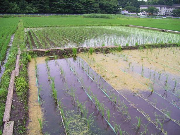 e70446cc.jpeg綾瀬の田んぼは27日の日曜で田植え後2週間。その前日の土曜日、補植作業に行ってきました。補植とは田植え後、ちゃんと根付かなかった苗を新しい苗と植え替える作業です。今年は結構上手く植えられていましたが、カルガモがなぎ倒して藻の中に埋もれてしまった苗は枯れたりしているのでそこに新しい苗を植えていきます。藻や雑草も生えはじめていて、これから大変です。写真は26日の田んぼです。