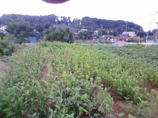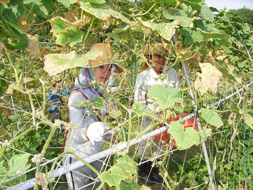 朝の行事、掃除に朝食を終えると車に乗って畑へ移動、研修生たちと野菜を収穫しました。参加者の中にはオクラがなっている姿を始めて見た人もいましたよ。