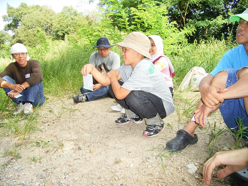 お昼前に着いた私たちは昼食を頂いた後、日本人スタッフの指導で研修生と一緒にネィチャーゲーム、自分がカメラになって自然を接写したり、自然界から指定された形を探してきたりしました。