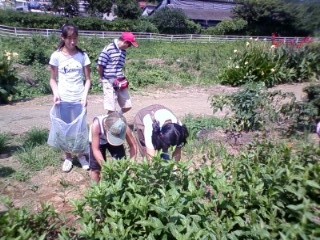 まずは16日に使うエコバッグを豆乳に漬けて干す作業。例年のハンカチと違って布の量が多いので大変でした。写真は畑にはためくエコバッグです。