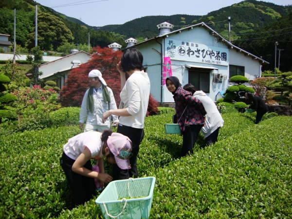 参加者は工場前の茶畑にカゴを持って散らばり、お茶の新芽を摘んでいきました。