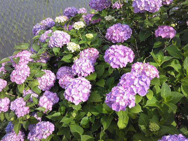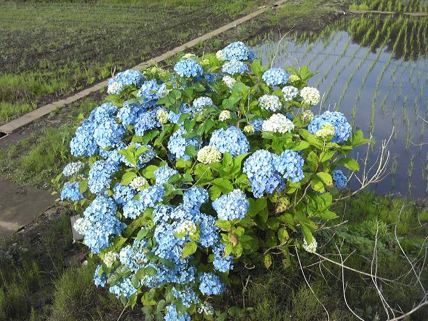 f7ee7109.jpeg地球チャイルドの畑の下には地主さんの田んぼが広がっています。そして田んぼと畑の間の斜面に紫陽花が3本植えてあります。74c5750f.jpeg田植え直後のこの時期には、いかにも梅雨らしい田植え直後の田んぼをバックにした紫陽花の花と言う風景が眼に映ります。3本の紫陽花はガク紫陽花が1本と、普通の紫陽花が2本ですが、色はすぐ青い花になるタイプと、しばらくは赤紫の花でいるタイプがあり、それそれの姿を楽しめます。3418a3b3.jpeg